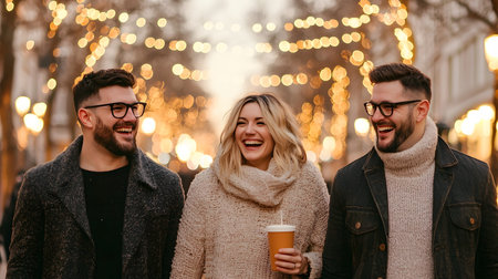 Three friends joyfully laugh while holding warm drinks, surrounded by twinkling lights, exuding warmth and happiness in a festive atmosphere of camaraderie and celebration.