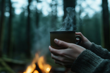 Close-up of hand holding steaming metal mug near fire in forest campsite at dusk. Relaxation in nature and camping lifestyle concept