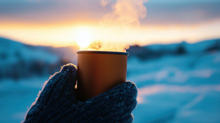 A close-up of mittens holding a steaming thermos, with a snowy field in the background.