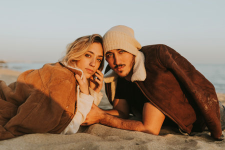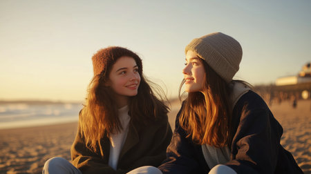 Two friends enjoying a sunset at the beach with warm smiles and cozy hats on a cool evening