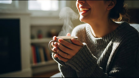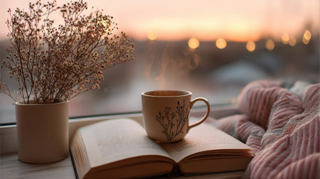 A cozy scene featuring a steaming cup of coffee or tea held by hands, with a stack of books and a vase in the background, sunlight streaming through a window