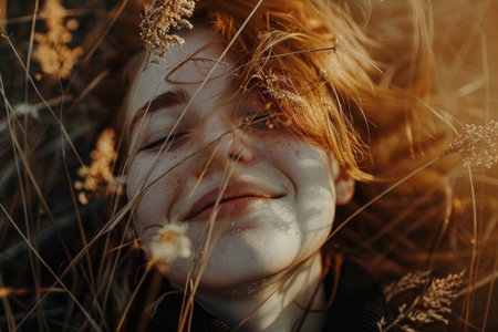 A woman with red hair lays in a field of tall grass, basking in the warm glow of the setting sun.