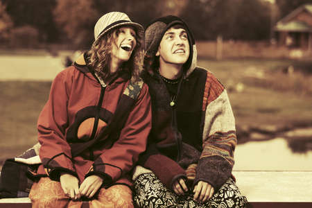 Happy young fashion hippie couple outdoor