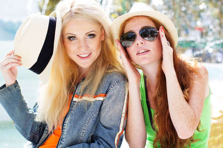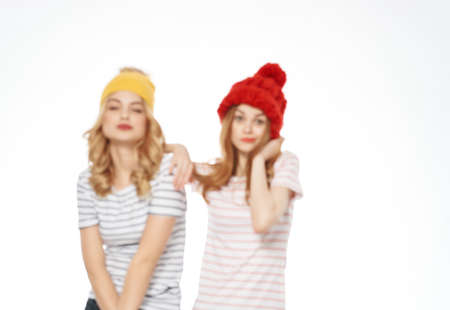 two cute girlfriends in colorful hats posing friendship modern style