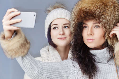 Two girl in winter clothes taking selfie pictures on smartphone.