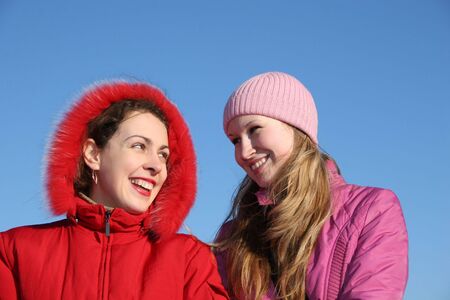 two bright and merry girls sitting in the frozen snowy park