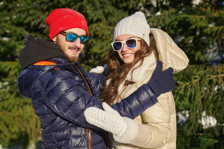 Cheerful young man and a girl are resting in a winter park on a sunny day. Happy winter day. Winter activities. Fashion.