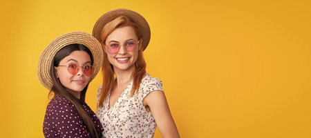 Mother and daughter kid banner, copy space, isolated background. smiling mother and child in straw hat on yellow background.