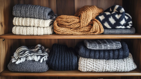 This image captures a cozy arrangement of knitted sweaters and scarves on wooden shelves, showcasing various textures and warm tones perfect for winter styling.