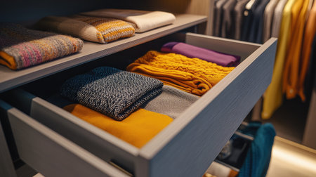 Organized closet drawer with neatly folded socks and clothing, modern wardrobe system.