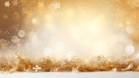 A close-up view of a textured surface with scattered snowflakes and glitter. In the background, out-of-focus golden bokeh lights create a warm and festive atmosphere. The snowflakes are delicate and crystalline, appearing to rest on a shimmering, golden-brown surface.