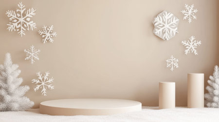 A serene winter backdrop featuring delicate white snowflakes on a beige wall, with soft textures and minimalist decor, perfect for seasonal photography.