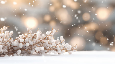 Winter branches with bokeh lights background holiday backdrop