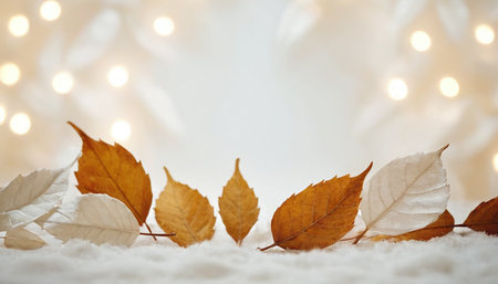 A close-up view of several autumn leaves, some brown and orange, others white, resting on a soft white surface resembling snow. The background is softly blurred with warm, out-of-focus bokeh lights, creating a gentle and festive atmosphere.