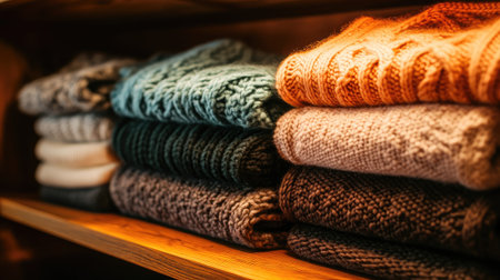 Warm and inviting knit sweaters neatly stacked on a wooden shelf, showcasing a variety of colors and textures. Perfect for a cozy atmosphere.