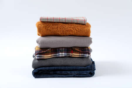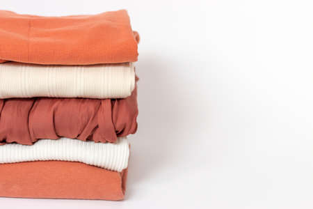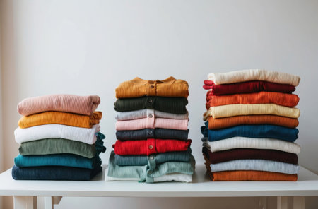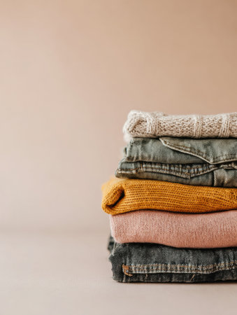 A stack of neatly folded spring clothing items rests in a corner of a studio. The neutral background offers a clean space for design purposes.
