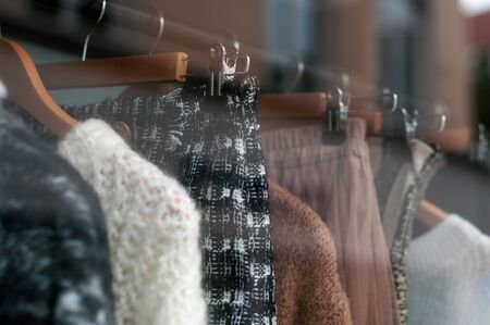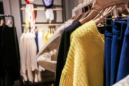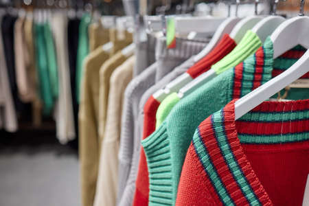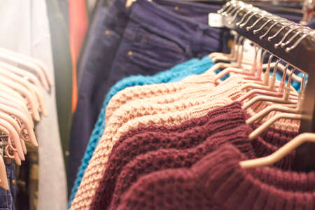 Sweaters on hangers. Shopping in store. Clothes on hangers in shop for sale. Blur background. Fashionable clothes in a boutique. Various clothing on market.
