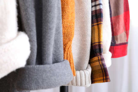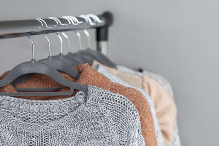 Collection of warm sweaters hanging on rack against graybackground, closeup