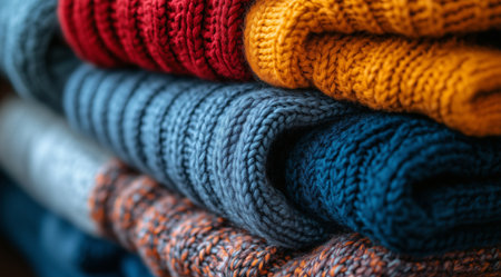 Colorful folded knitwear stack showcasing vibrant seasonal fashion trends and textures.