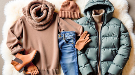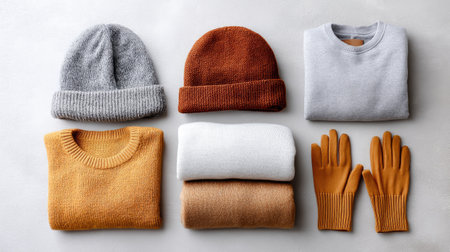 This image features a stylish arrangement of cozy knitwear and accessories, perfect for autumn fashion. Soft textures and warm colors evoke comfort.