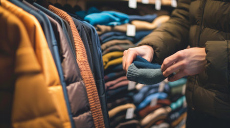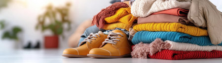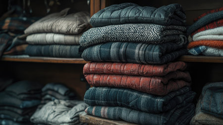 A visually appealing display of neatly stacked winter clothing on a rustic wooden shelf, showcasing vibrant colors and cozy textures for seasonal inspiration.