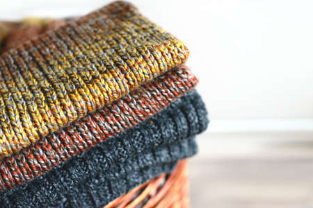 Clean woolen clothes in stack, top view. Stack of knitted warm clothes on wooden background. Knitted color clothes, vintage style. Pile of sweaters on table. Autumn, winter season knitwear.