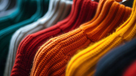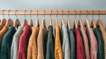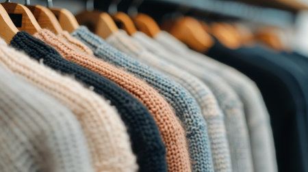 A vibrant display of clothing on hangers showcasing a variety of sweaters in soft tones. Perfect for fashion, retail, or home decor inspiration.