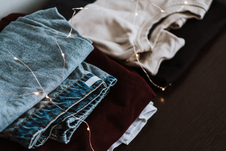 Stack of folded clothes at home on a wooden table decorated with a garland.