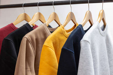 Blank sweatshirts hanging on a hanger in the wardrobe or showroom