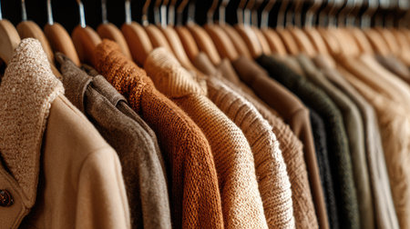 A warm and inviting display of various knit sweaters and jackets hanging on wooden hangers, perfect for autumn and winter wardrobe updates.
