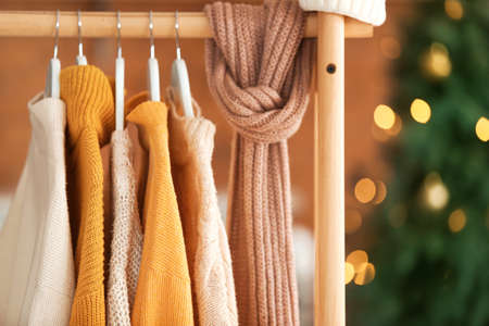 Knitted clothes with folded sleeves hang on hanger indoors closeup. Winter season.