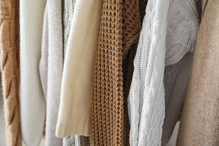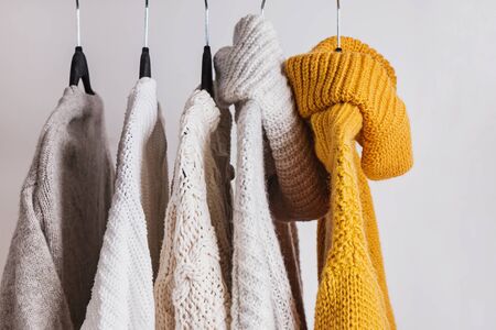 Pastel warm knitted clothes sweater hanging in the closet. Sweaters on gray hangers. Concept cozy autumn and winter wardrobe.