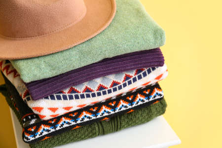 Stack of stylish sweaters and felt hat on chair near color wall, closeup