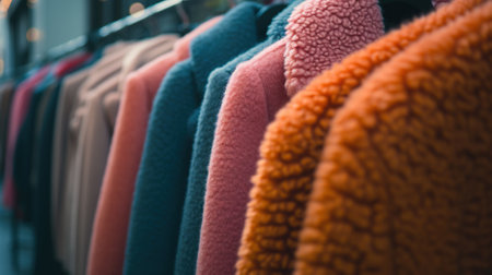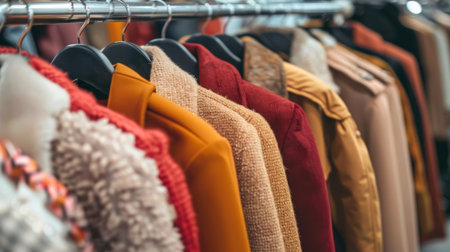 Boutique clothing rack featuring a variety of fashionable and stylish outerwear in warm tones. concept of fashion retail, style selection, clothing display.