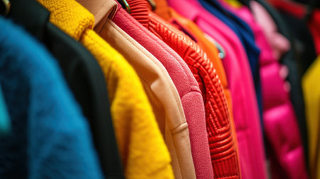 Close-up view of a boutique clothing rack with various stylish garments, textures, and vibrant colors in a trendy store. concept of fashion, clothing diversity, retail style.