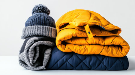 A warm winter coat and beanie, folded neatly and isolated on a white background, ready for cold-weather travel