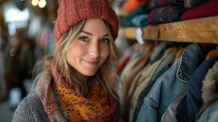 Stylish Woman with a Beanie Smiling in a Clothing Store