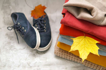 Pile of colorful sweaters in warm tones and eyeglasses with metal frames. Selective focus.