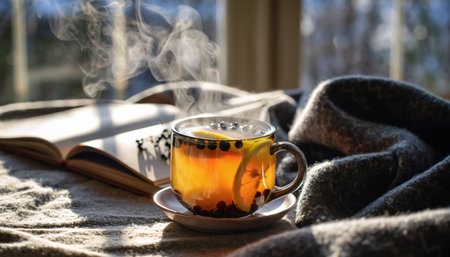 Warm herbal infusion with elderberries and lemon slice steaming in glass mug, surrounded by open books and cozy blanket in golden sunlight. Perfect for wellness, relaxation, and lifestyle content.