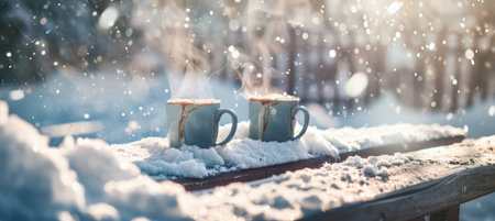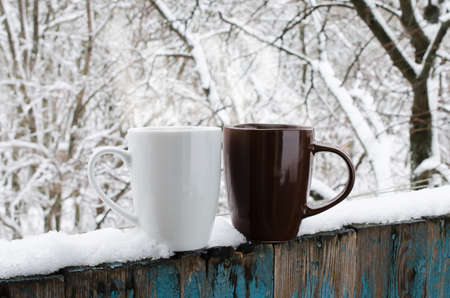 Two Cups of Hot Coffee or Tea on a Snow Covered Terrace.