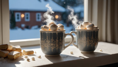 Two decorative mugs filled with rich hot chocolate and fluffy marshmallows sit on a windowsill, steam rising gently as snow blankets the outside world.