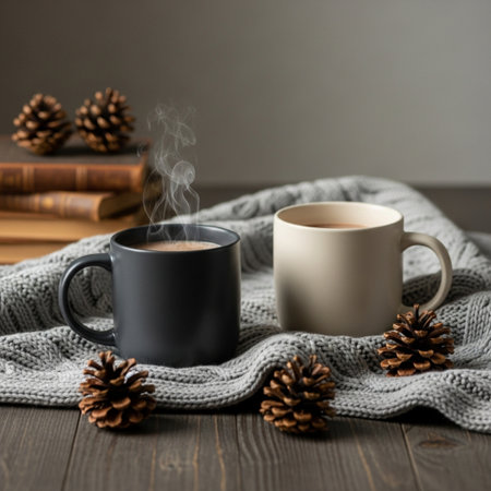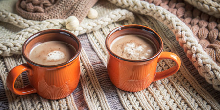 Warmth and Comfort from Steamy Coffee in Woolen Cozies on a Cozy Indoor Table Setting