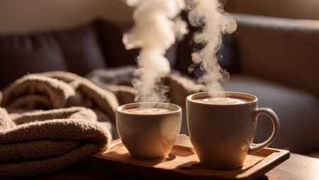 Hot cocoa with rising steam on a cozy coffee table