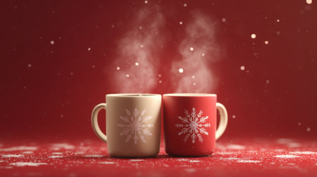 Two steaming mugs in festive colors sit close together on a red backdrop, evoking warmth and holiday cheer in a cozy winter setting.