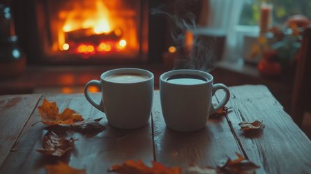 Steaming Coffee Mug on Wooden Table by Cozy Fireplace