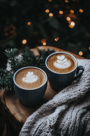 AI Generated. Two mugs of warm spiced drink surrounded by winter