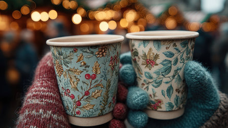 Two beautifully designed paper coffee cups held together in colorful winter gloves, set against a vibrant outdoor market filled with festive lights.
