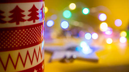 Christmas decoration with red cup of chocolate, red scarf, white lantern, star blinker, balls and bauble deer on wood table with copy space. Bokeh Christmas tree wallpaper for xmas celebration.