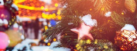 Close up of part of Christmas tree with different christmas toys and garland on street in evening city. Coniferous tree with decorative decorations to create festive mood.