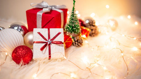 Christmas decoration on white hairy carpet with illuminated lights. Gift box with ribbon, glossy ball, pine cone and Christmas tree on fluffy rug. Present and decorative objects for New Year holiday